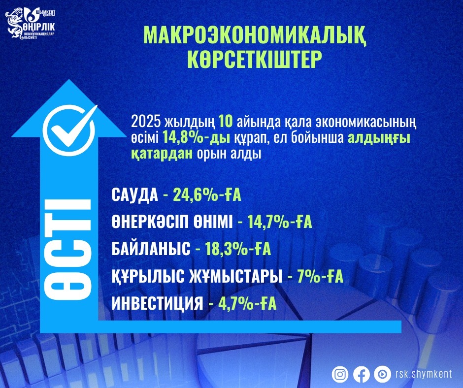 Шымкент қаласының әлеуметтік-экономикалық дамуы соңғы жылдары тұрақты және қарқынды сипат алып келеді. Қала экономикасының негізгі салаларында жүйелі өсім қамтамасыз етіліп, өндіріс көлемінің ұлғаюы, инвестиция тарту деңгейінің артуы, құрылыс қарқынының жеделдеуі және қызмет көрсету саласының дамуы айқын байқалуда. Бұл көрсеткіштер Шымкент қаласының ел экономикасындағы маңызын арттырып, республикалық деңгейде алдыңғы қатардан көрінуіне мүмкіндік беріп отыр.