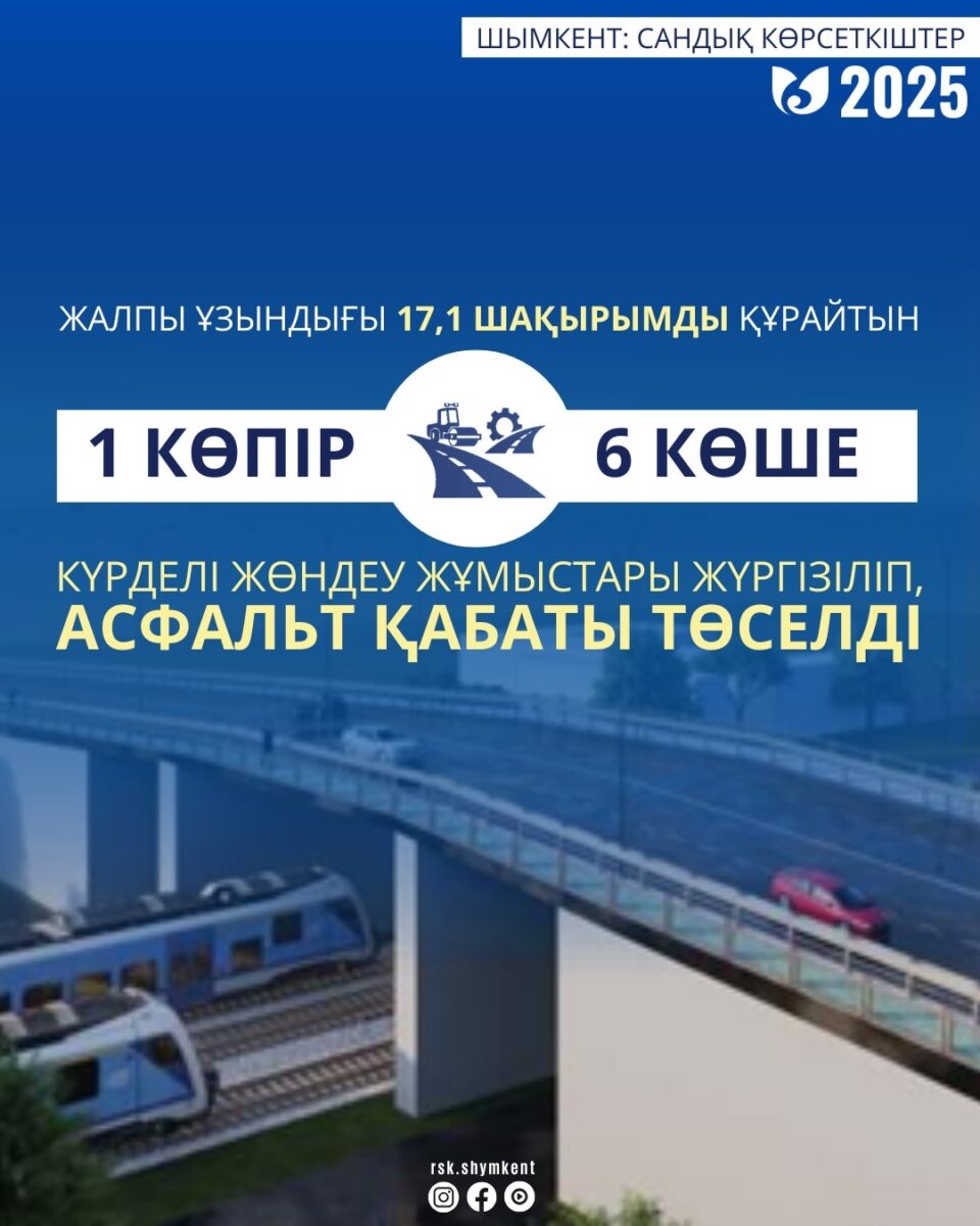 ШЫМКЕНТ: ЖОЛ ИНФРАҚҰРЫЛЫМЫ ЖАҢАРТЫЛУДА. 2025 жылы Шымкент қаласында жол-көлік инфрақұрылымын дамыту бағытындағы жұмыстар жүйелі әрі жоспарлы түрде жүзеге асырылуда. Қала аумағында көлік қозғалысының сапасын арттыру, жол қауіпсіздігін қамтамасыз ету және тұрғындарға қолайлы жағдай жасау басты басымдықтардың бірі болып отыр. Осы мақсатта биыл жалпы ұзындығы 17,1 шақырымды құрайтын 1 көпір мен 6 көше күрделі жөндеуден өтті.