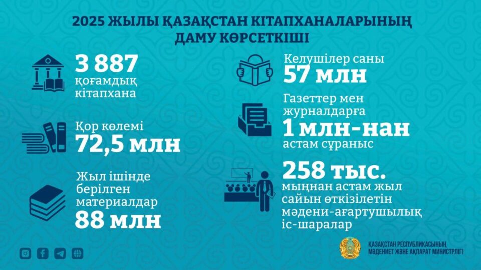 Кітапханалар желісін дамыту басқа өңірлерде де жалғасын тапты. Қызылорда облысында «Руханият» орталығы пайдалануға берілсе, Батыс Қазақстан облысында 25 ауылдық кітапхананы жаңғыртуға арналған пилоттық жоба жүзеге асты. Бұл бастамалардың барлығы кітапхананы оқырманға жақындатып, заманауи мәдени-ағартушылық орталыққа айналдыруды мақсат етеді.