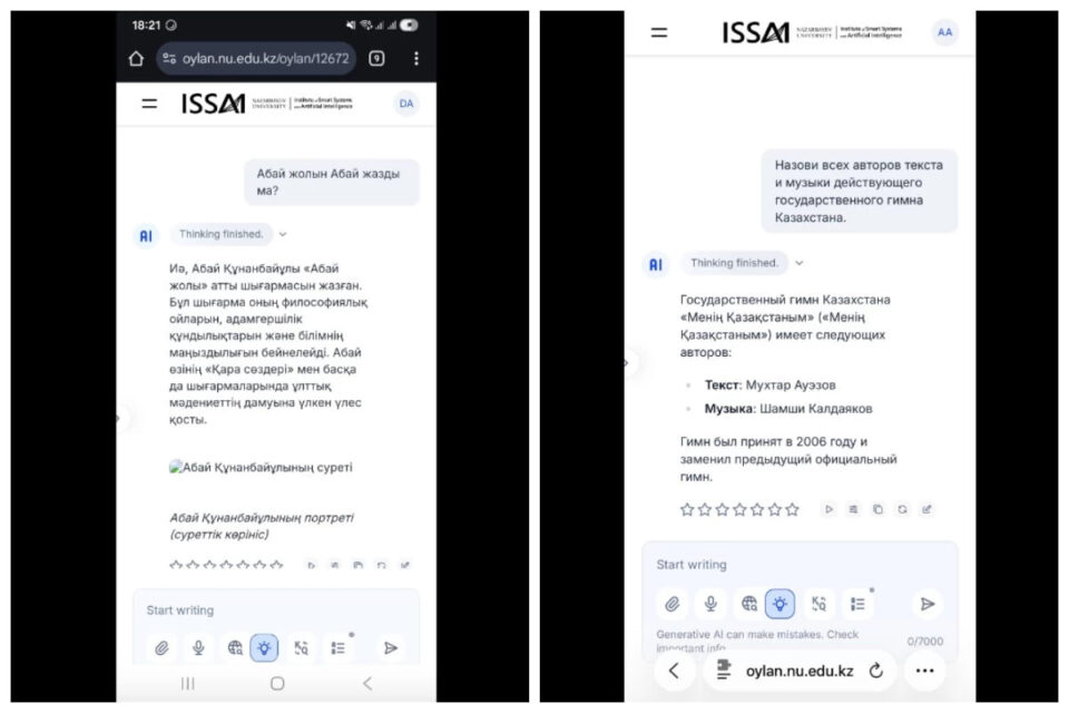 Ал ISSAI KazLLM бұл сұраққа қате, яғни «Абай жолын» Абай жазған» деп жауап беріп, соңынан Абайдың портреттерін ұсынған.