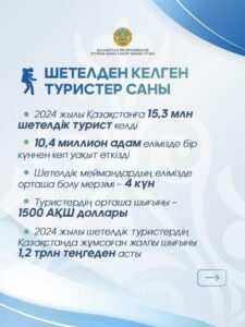 Ұлттық банк мәліметінше, алыс шетелден келген туристер Қазақстанға сапары кезінде орта есеппен 1500 АҚШ долларын жұмсайды. 2024 жылы шетелдік туристер еліміздің аумағында 1,2 трлн теңгеден астам қаражат жұмсады.