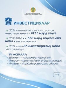 2019-2024 жылдар аралығында туризм саласында жалпы сомасы 550 млрд теңгеге 605-тен астам инвестициялық жоба іске асырылды, оның ішінде 2024 жылы 87 инвестициялық жоба сәтті аяқталды.