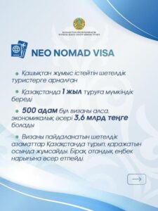 Сонымен қатар былтыр Мемлекет басшысы Қасым-Жомарт Тоқаевтың тапсырмасы бойынша Neo Nomad деп аталатын жаңа виза түрі енгізілді. Бұл виза заманауи көшпенділерге – саяхаттап, қашықтан жұмыс істейтін шетелдік туристерге арналған. Жаңа визалық режимді енгізер кезде пандемиядан кейін осындай бағдарламаларды сәтті қолданған 50-ден астам елдің халықаралық тәжірибесі назарға алынған.