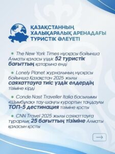 Сонымен қатар CNN Travel 2025 жылы саяхаттауға тұрарлық 25 бағыттың тізімін жариялап, Қазақстанды ерекше мәртебеге лайық деп таныды. Атап айтқанда, Алматы қаласы саяхаттауға тиіс ең үздік бағыттардың қатарына енді. Қала кең табиғи ландшафттар мен дамып келе жатқан урбанистік мәдениетті біріктіретін ерекше атмосферасының нәтижесінде Орталық Азияның «жаңа стиль астанасы» деп аталды.