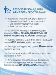 2027 жылға дейін жалпы құны 1,1 трлн теңгеден асатын 181 инвестициялық жоба іске асырылады. Туризм саласында жұмыспен қамтылғандар санын 800 мың адамға дейін арттырып, агротуризмді дамыту есебінен ауылдық жерлерде 10 мың жаңа жұмыс орнын ашу жоспарланған.