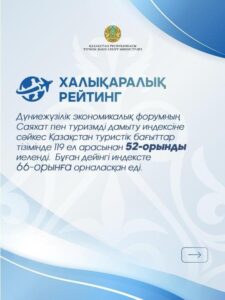 Елдегі туризм саласында іске асырылып жатқан жүйелі іс-шаралардың нәтижесінде Қазақстанға келетін туристер саны да, әлемдік рейтингтегі орнымыз да айтарлықтай жақсарып келеді. Мәселен, Дүниежүзілік экономикалық форумның (World Economic Forum) Саяхат пен туризмді дамыту индексіне сәйкес Қазақстан туристік бағыттар тізімінде 119 ел ішінде 52-орынды иеленді. Бұған дейінгі индексте Қазақстан 66-орынға орналасқан еді.